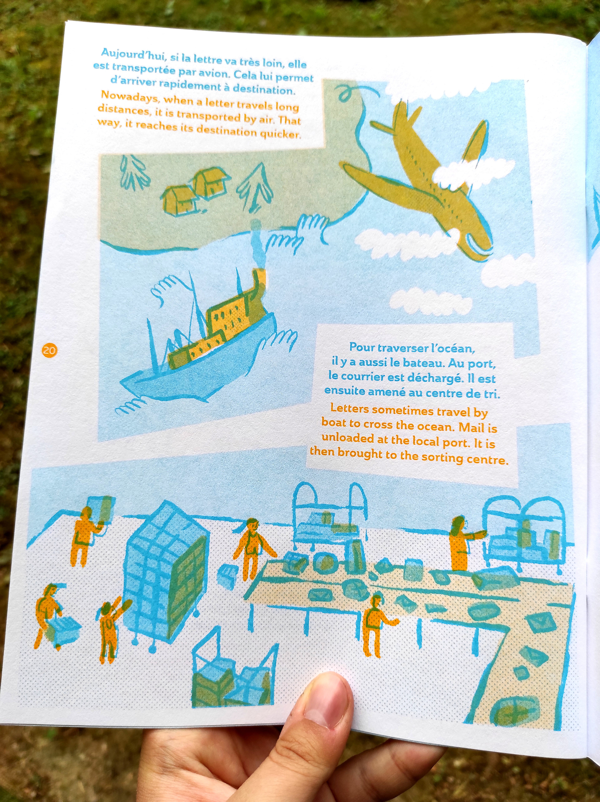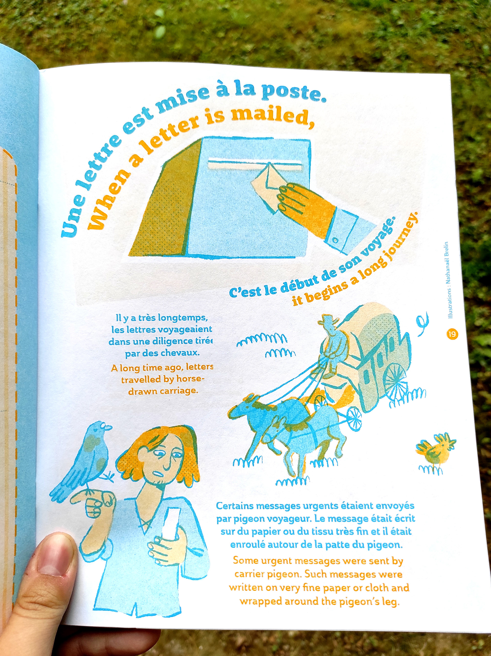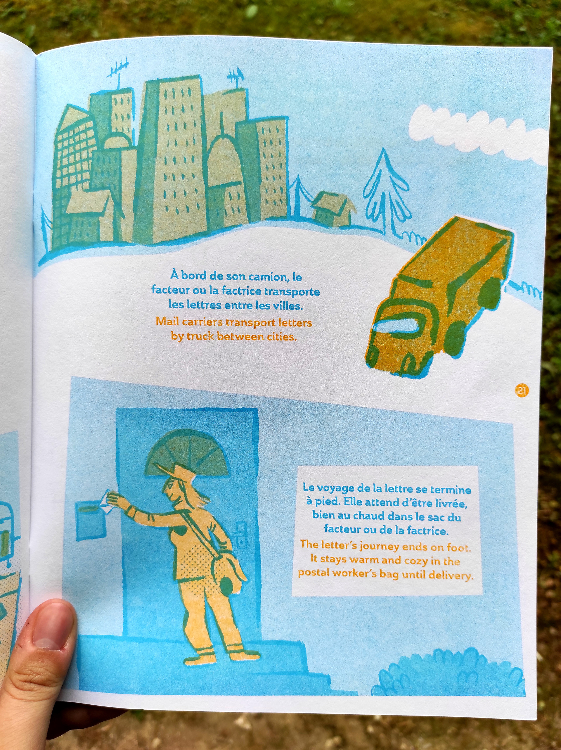 Trois pages d'illustrations pour le magazine canadien bilingue Grilled Cheese (version 2-4 ans), n°15, publié en juin 2022, et imprimé en risographie.